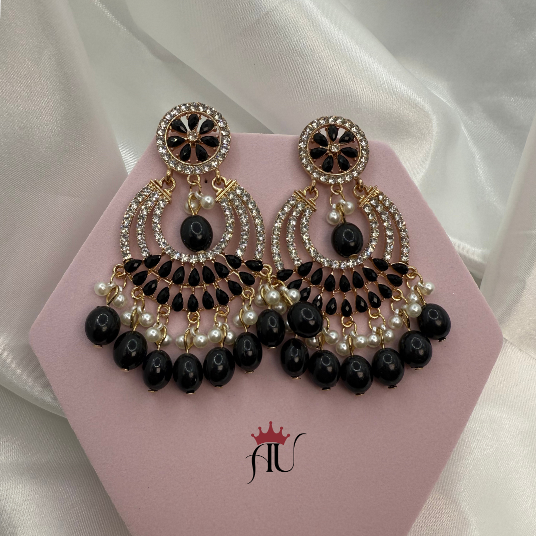 Elevate your ensemble with these exquisite Zeenat-e-Naaz Earings, a stunning fusion of traditional elegance and contemporary charm. Featuring a dazzling arrangement of black stones, shimmering white pearls, and sparkling rhinestones, these earrings are meticulously crafted to make a bold statement. Zeenat-e-Naaz Elegant Earrings The intricate design showcases tiered arches, teardrop embellishments, and luxurious hanging beads, all set in a rich gold-toned frame.Zeenat-e-Naaz Elegant Earrings