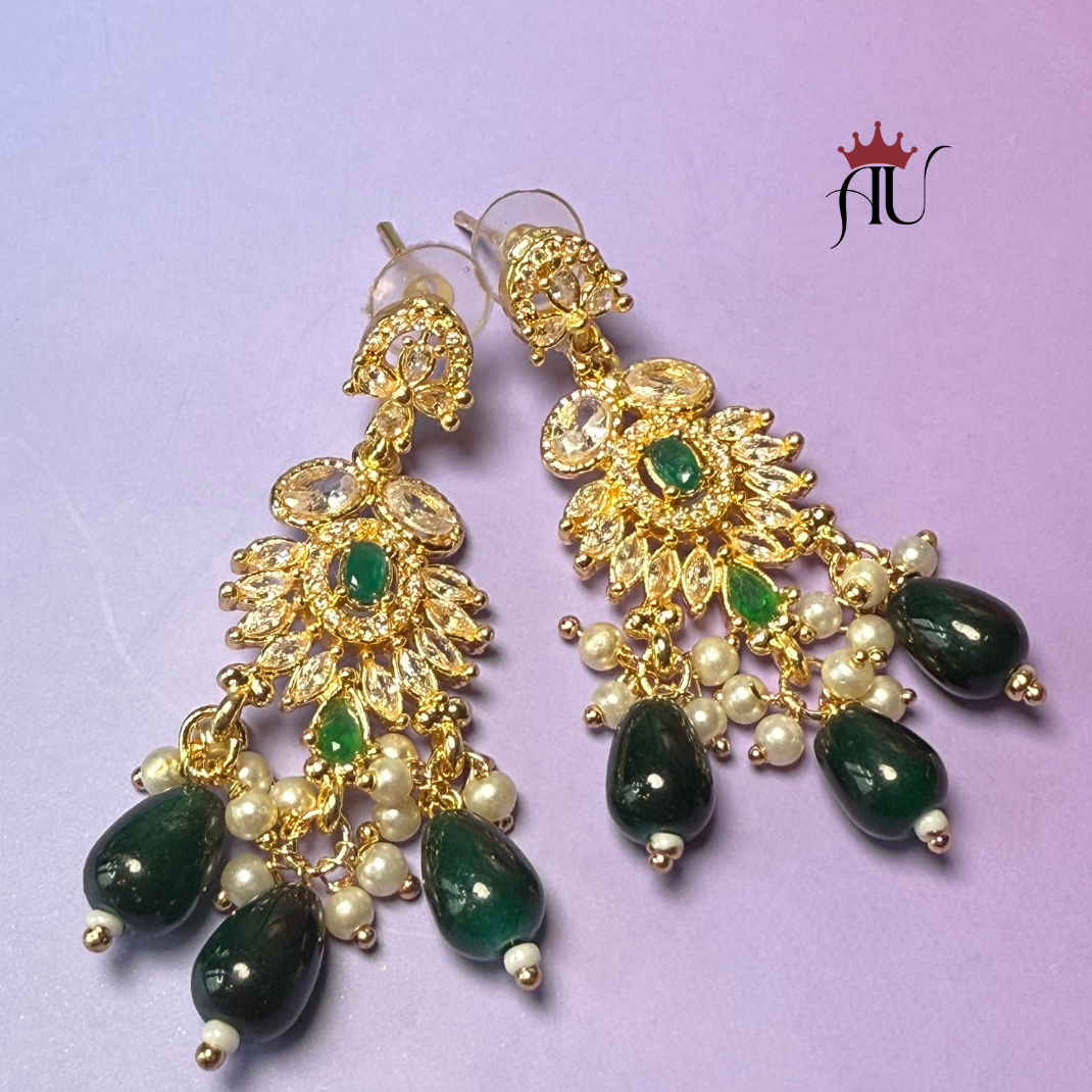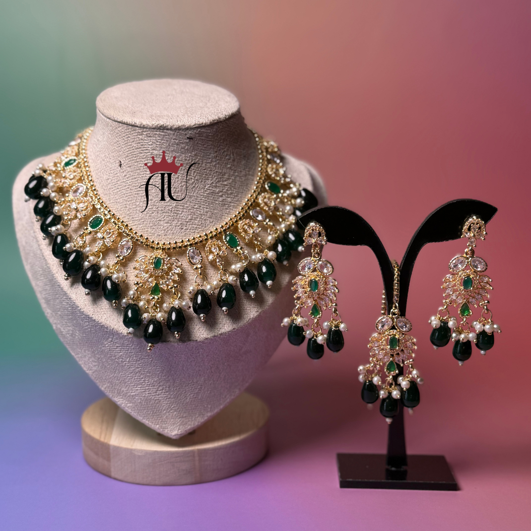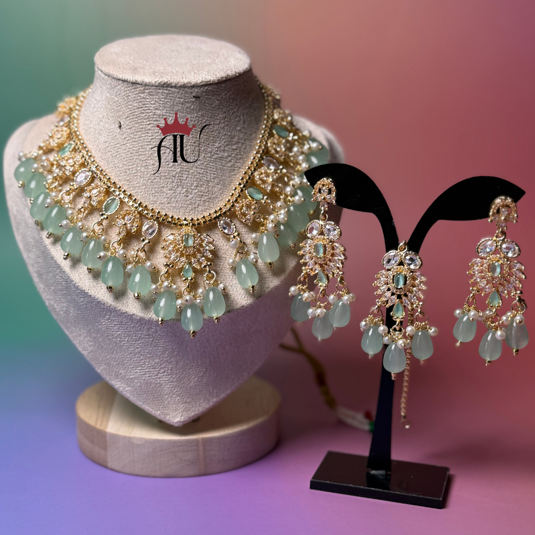 Add a touch of regal elegance to your wardrobe with this luxurious Kundan & Pearl Jewelry Set. Kundan Pearl Jewelry SetThis beautifully crafted set features a statement choker necklace adorned with soft green teardrop beads, intricate kundan stones, and delicate pearl accents, all set in a gleaming gold-tone base. Paired with matching chandelier earrings, this set is a perfect blend of sophistication and tradition.Kundan Pearl Jewelry Set