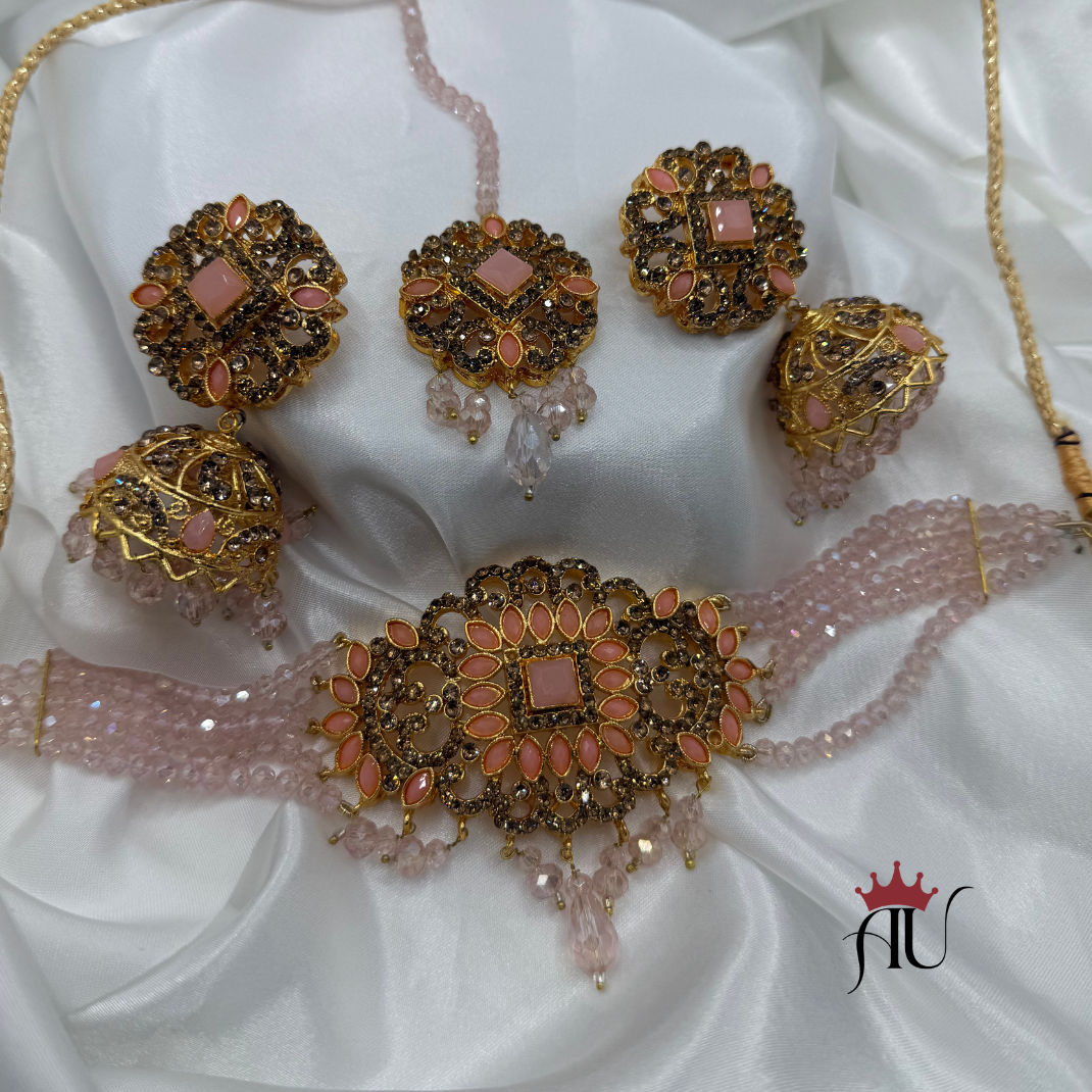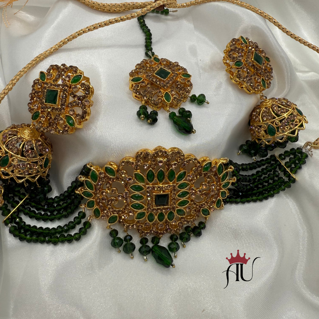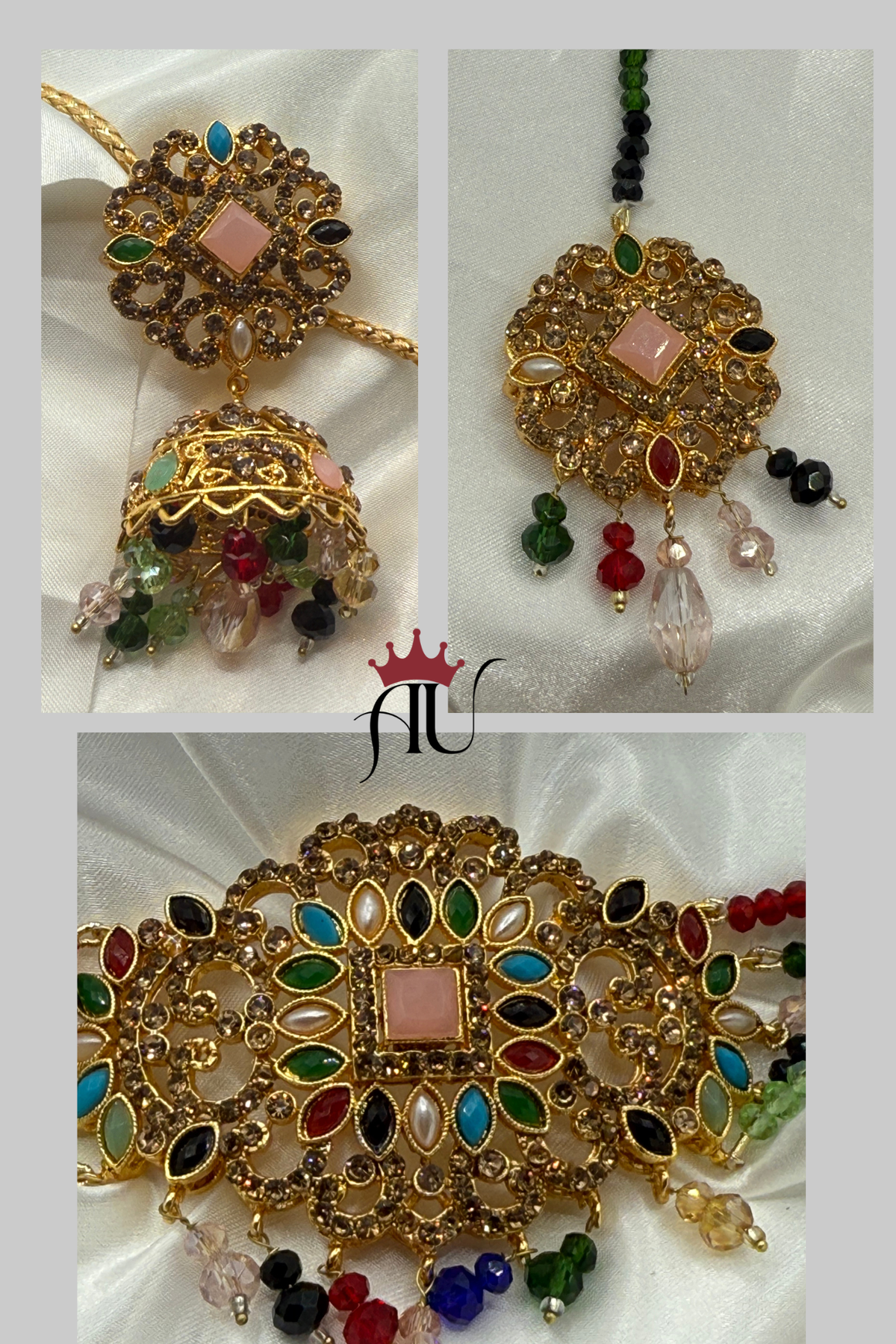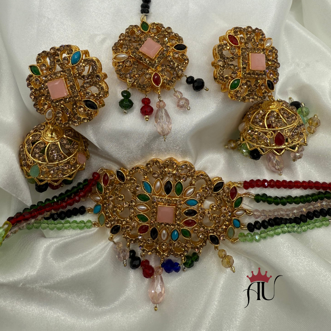 Elevate your elegance with this intricately crafted jewelry set featuring a beautifully detailed choker, matching earrings, and a traditional maang tikka.traditional Noor-e-Rang jewelry set. Each piece is adorned with fine cut stones and delicate beadwork, combining classic artistry with a regal touch. traditional Noor-e-Rang jewelry set.Ideal for weddings, festive occasions, or cultural celebrations, this set offers a timeless design that complements both traditional and contemporary attire. A statement piece designed to captivate.traditional Noor-e-Rang jewelry set