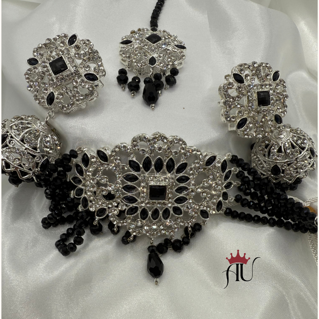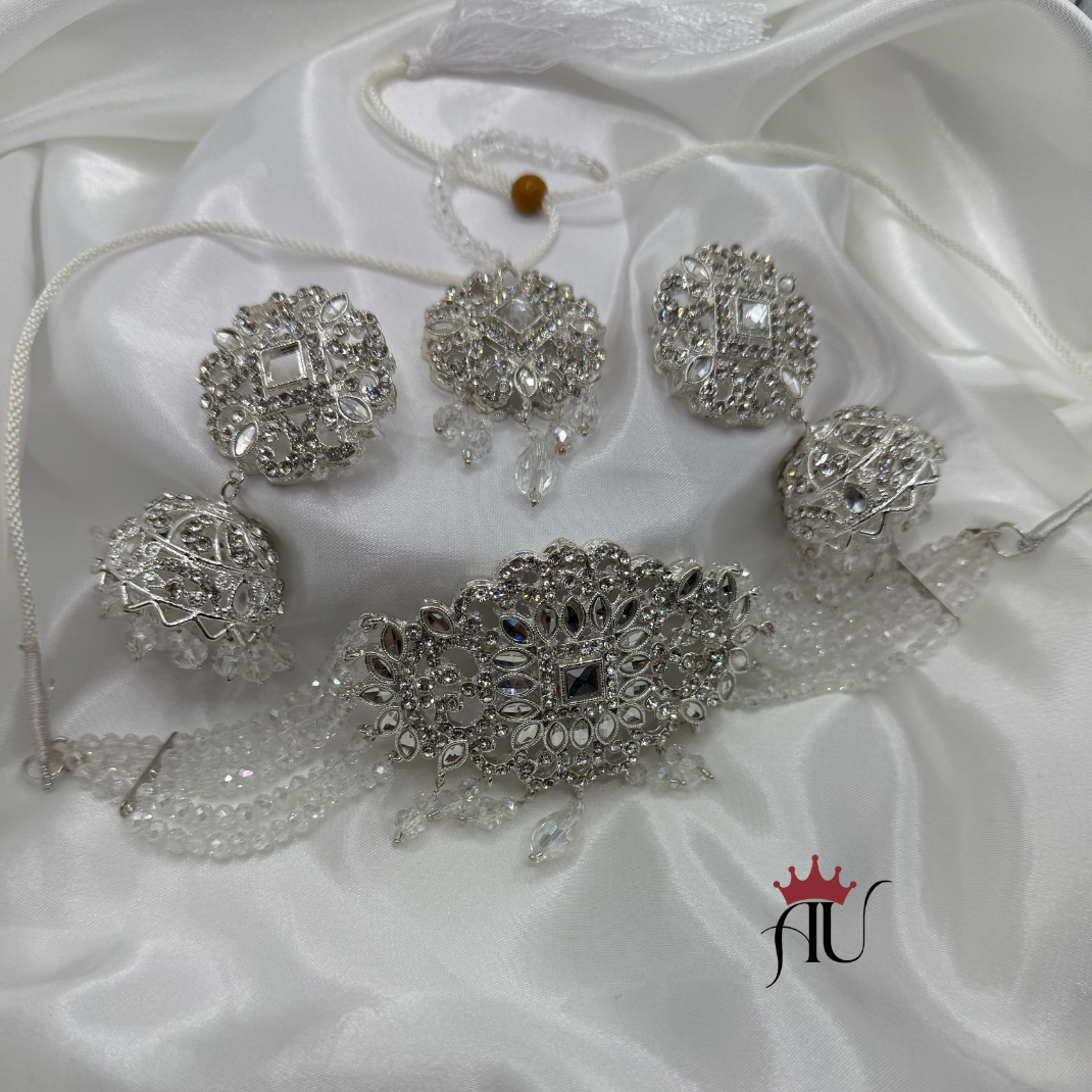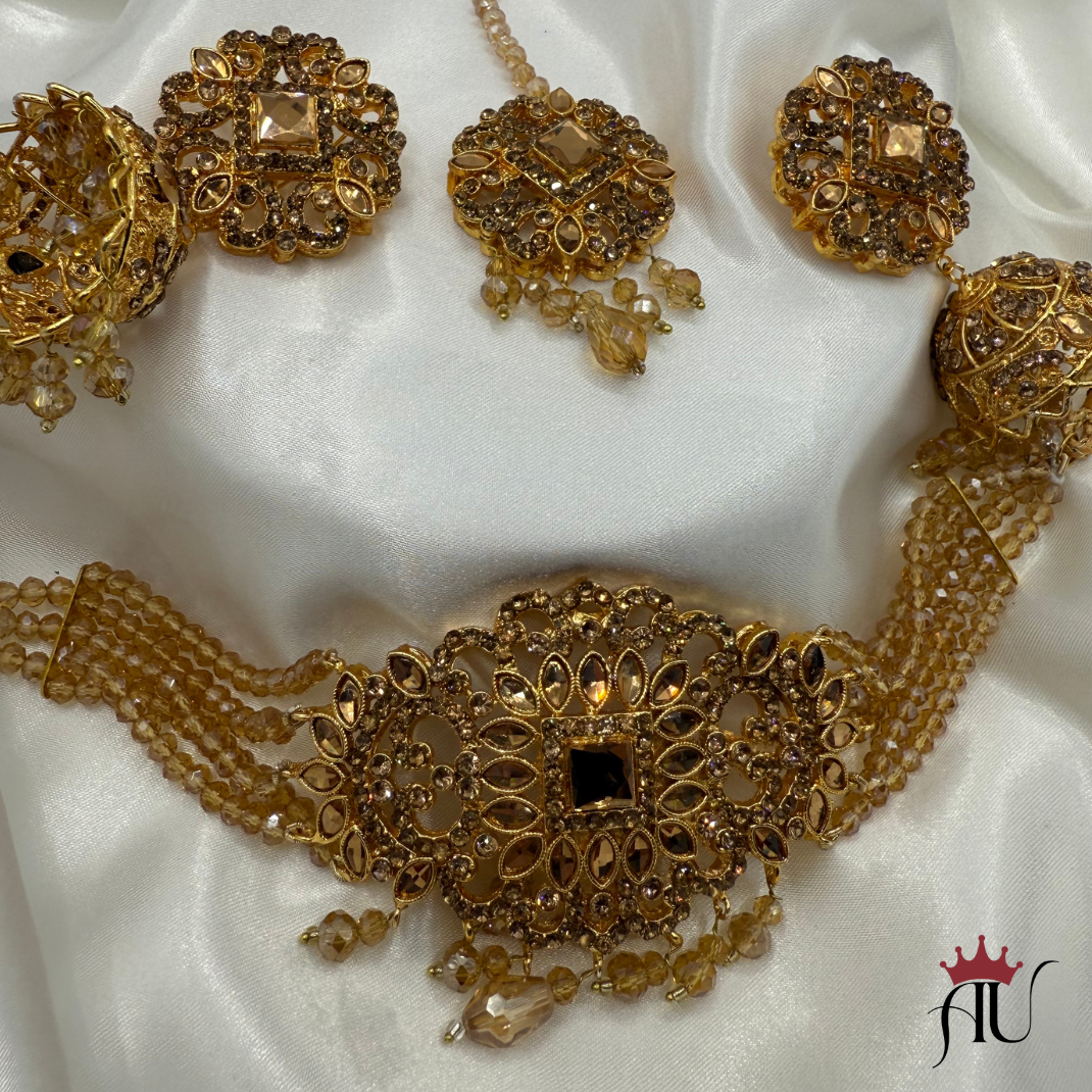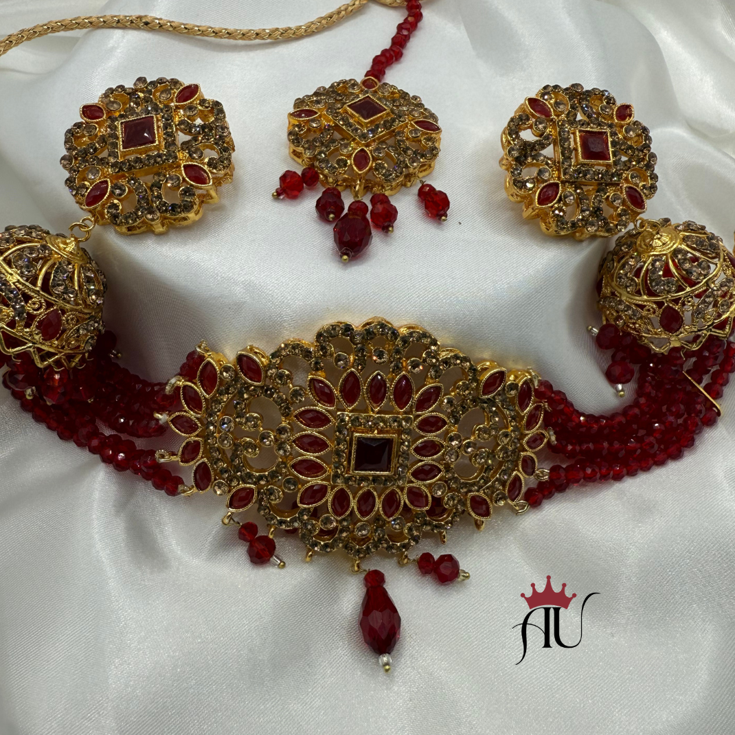 Elevate your elegance with this intricately crafted jewelry set featuring a beautifully detailed choker, matching earrings, and a traditional maang tikka.traditional Noor-e-Rang jewelry set. Each piece is adorned with fine cut stones and delicate beadwork, combining classic artistry with a regal touch. traditional Noor-e-Rang jewelry set.Ideal for weddings, festive occasions, or cultural celebrations, this set offers a timeless design that complements both traditional and contemporary attire. A statement piece designed to captivate.traditional Noor-e-Rang jewelry set
